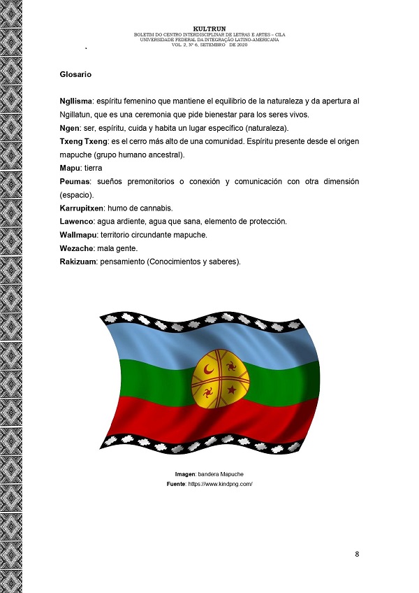 Nigllisma – espírito feminino que mantém o equilíbrio da natureza e da abertura ao Ngillatun, que é uma cerimônia que pede bem estar para os seres vivos. Ngen – ente, espírito, cuida e habita um lugar específico (natureza). Txeng Txeng – é a montanha mais alta de uma comunidade. Espírito presente desde a origem mapuche (grupo humano ancestral). Mapu – terra Peumas – sonhos premonitórios ou conexão e comunicação com outra dimensão (espaço). Karrupitxen – fumaça de cannabis. Lawenco – água ardente, água que cura, elemento de proteção. Wallmapu – território circundante mapuche. Wezache – gente má. Rakizuam – pensamento (conhecimento e saberes)