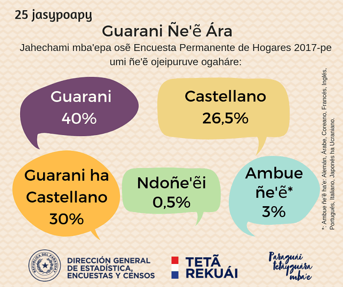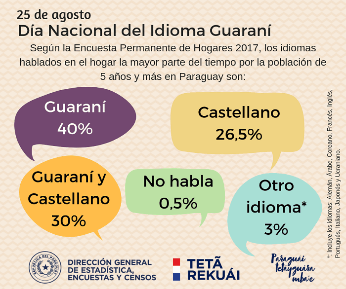 Segundo a Pesquisa Permanente de Moradias, feita pelo Instituto de Estatística do Paraguai em 2017, os idiomas falados no local de moradia, a maior parte do tempo, pela população com mais de 5 anos eram: o guarani (40%), o castelhano (espanhol) (26,5%), guarani e castelhano (30%). Outros idiomas entre os quais se incluem o alemão, árabe, coreano, francês, inglês, português, italiano, japonês e ucraniano, somavam (3%).