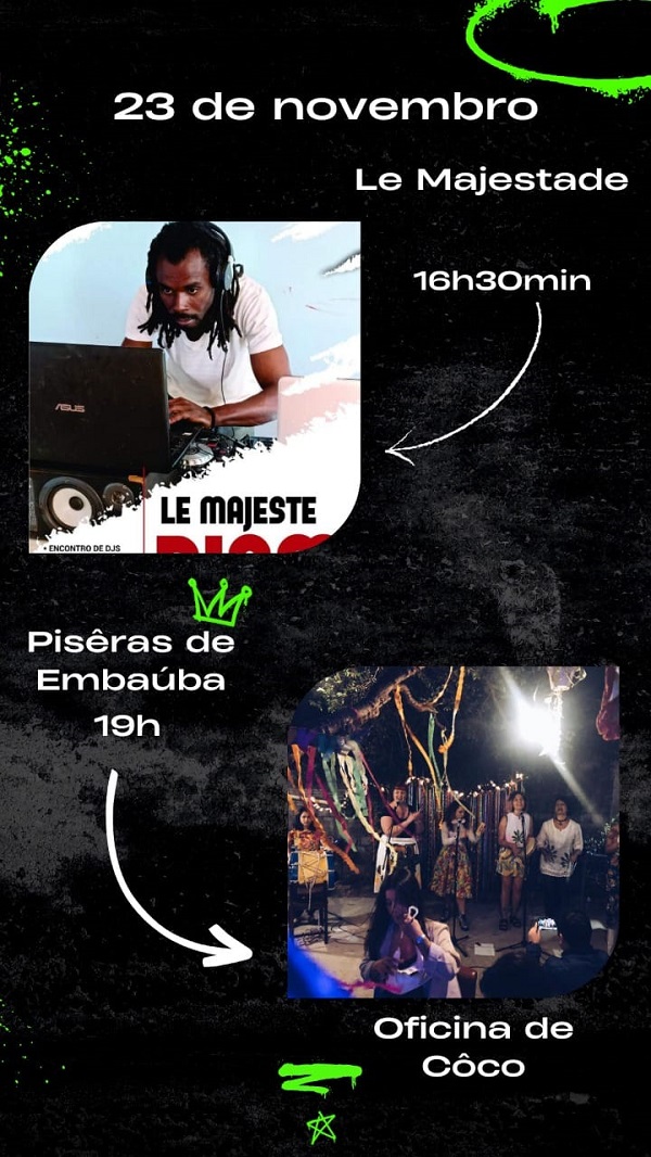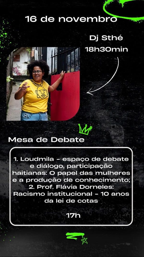 Dia 16 será a vez da Dj Sthé incrementar suingue no campus. Na mesma tarde, a acadêmica Loudmila ocupa o espaço de debate e diálogo para abordar a participação haitiana, a produção de conhecimento e o papel das mulheres. Dividindo a mesa de debates com ela, a professora Flávia Dorneles aborda a questão do racismo institucional e os dez anos da lei de cotas.O Dj Le Majeste embala a Feirinha no dia 23. Completa a programação o coletivo de dança Pisêras de Embaúba com uma oficina de Coco. .
