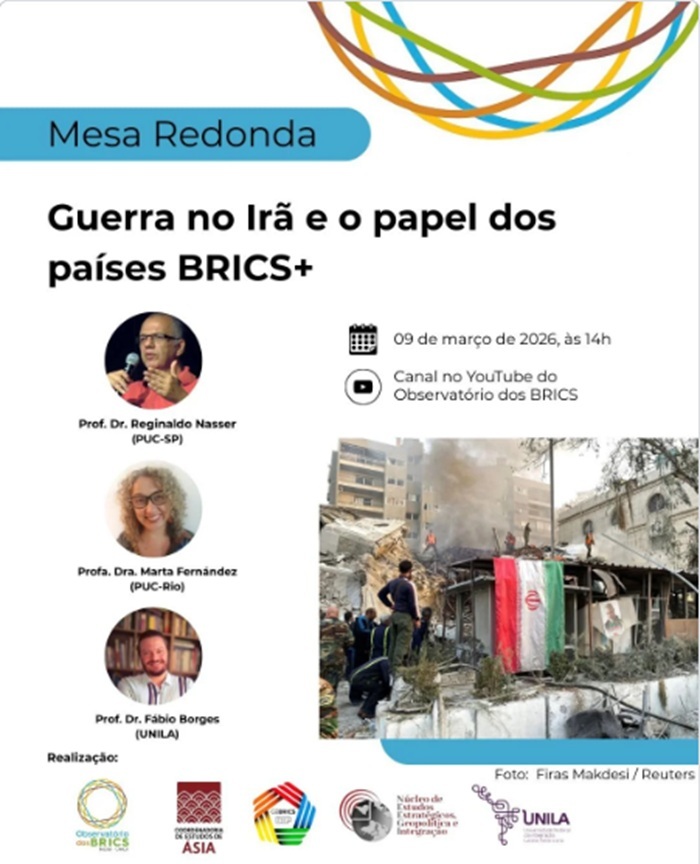 O Observatório dos BRICS (UNILA), em parceria com a Curadoria dos BRICS (CEÁSIA-UFPE) e com o GEBRICS (USP), convida a comunidade acadêmica e o público em geral para a mesa redonda online “Guerra no Irã e o papel dos países BRICS+”.