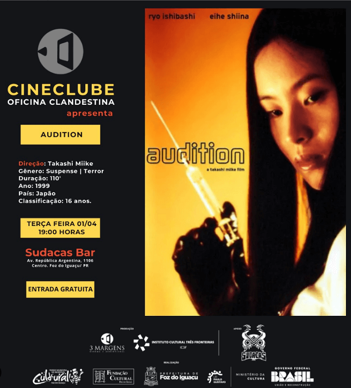 Nesta terça (01 de abril), o Cineclube Oficina Clandestina promove sessão de cinema no Sudacas Bar, a partir das 19 horas. O filme escolhido para a noite é “Audition”, do diretor japonês Takashi Miike. Entrada franca, aconselhável para a faixa etária dos 16 anos.