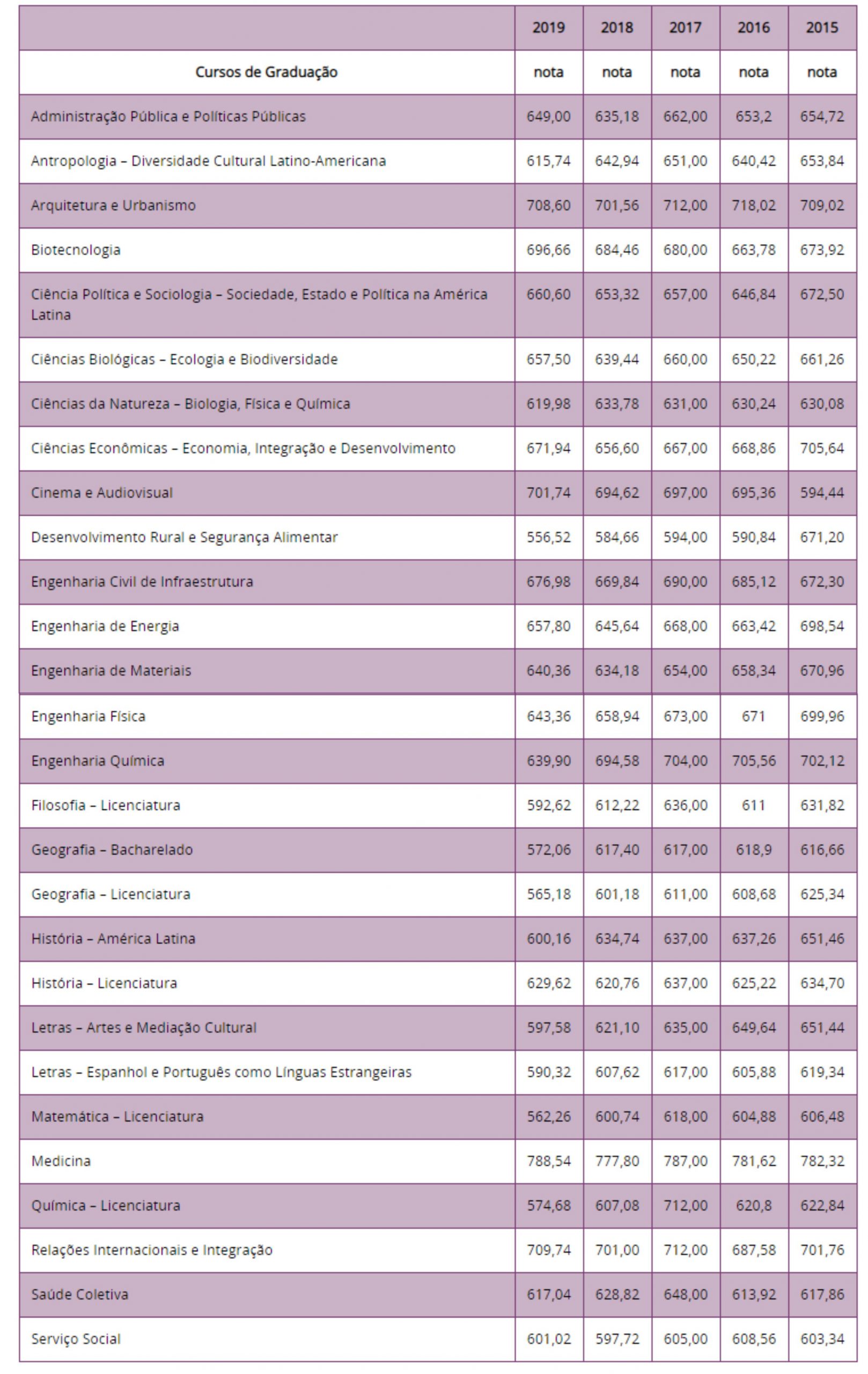 O Ministério da Educação divulgou, nesta sexta-feira (17), as notas do Enem, que são utilizadas para o ingresso em todos os 29 cursos de graduação da UNILA, por meio do SiSU ou por seleção própria (exclusivamente para o curso de Música). O estudante interessado em ingressar na UNILA deve fazer sua inscrição no Sistema de Seleção Unificada (SiSU), de 21 a 24 de janeiro, usando a nota do Enem.Neste ano, a UNILA está oferecendo, inicialmente, 823 vagas via SiSU. O número cresceu em relação aos anos anteriores porque nem todas as vagas oferecidas para estudantes estrangeiros foram preenchidas. Essas vagas foram transferidas para a seleção de brasileiros.Além da chamada feita pelo SiSU – agendada para o dia 28 de janeiro – a UNILA programou outras três chamadas – dias 17 de fevereiro, 3 e 9 de março.No quadro abaixo, podem ser conferidas as notas de corte da chamada regular do SiSU (para ampla concorrência) nos cursos da UNILA nos últimos cinco anos. Para ampliar, clique na imagem.