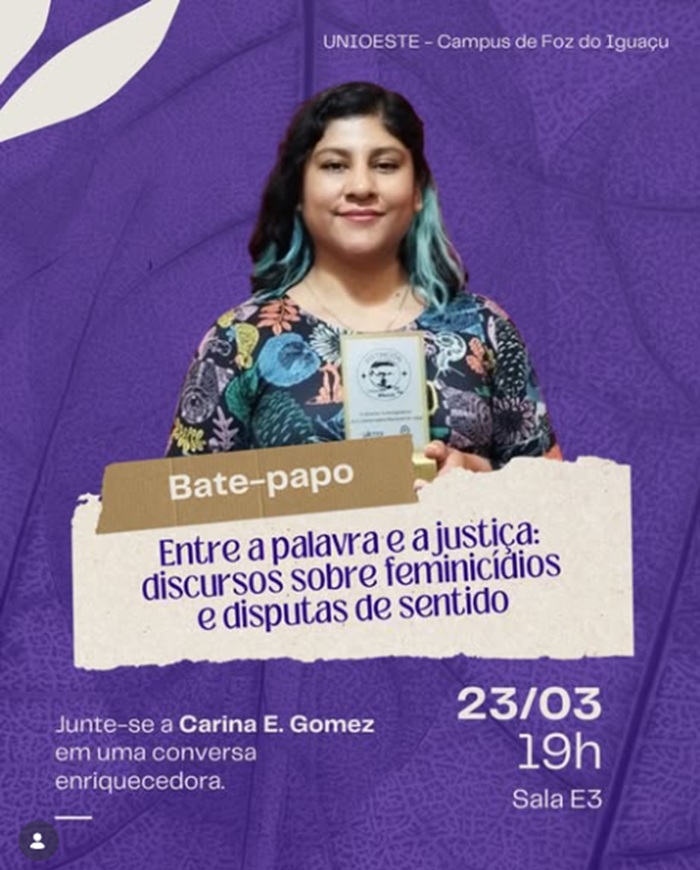 Nesta segunda-feira (23), ocorre um encontro para refletir sobre a linguagem e o sistema de Justiça. O Centro Acadêmico do curso de Letras convida para a palestra “Entre a palavra e a justiça: discursos sobre feminicídios e disputas de sentido”, com a pesquisadora Carina E. Gomez.