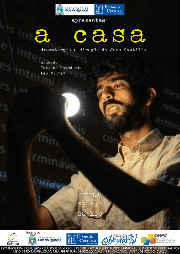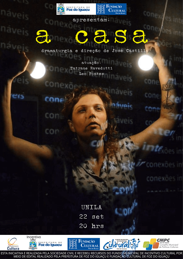 Peça teatral “A Casa” Dia: 22 de setembro Horário: 20h Local: UNILA – Unidade Jardim Universitário, sala C-111 (prédio central) – Avenida Tarquínio Joslim dos Santos, 1000. Entrada: gratuita