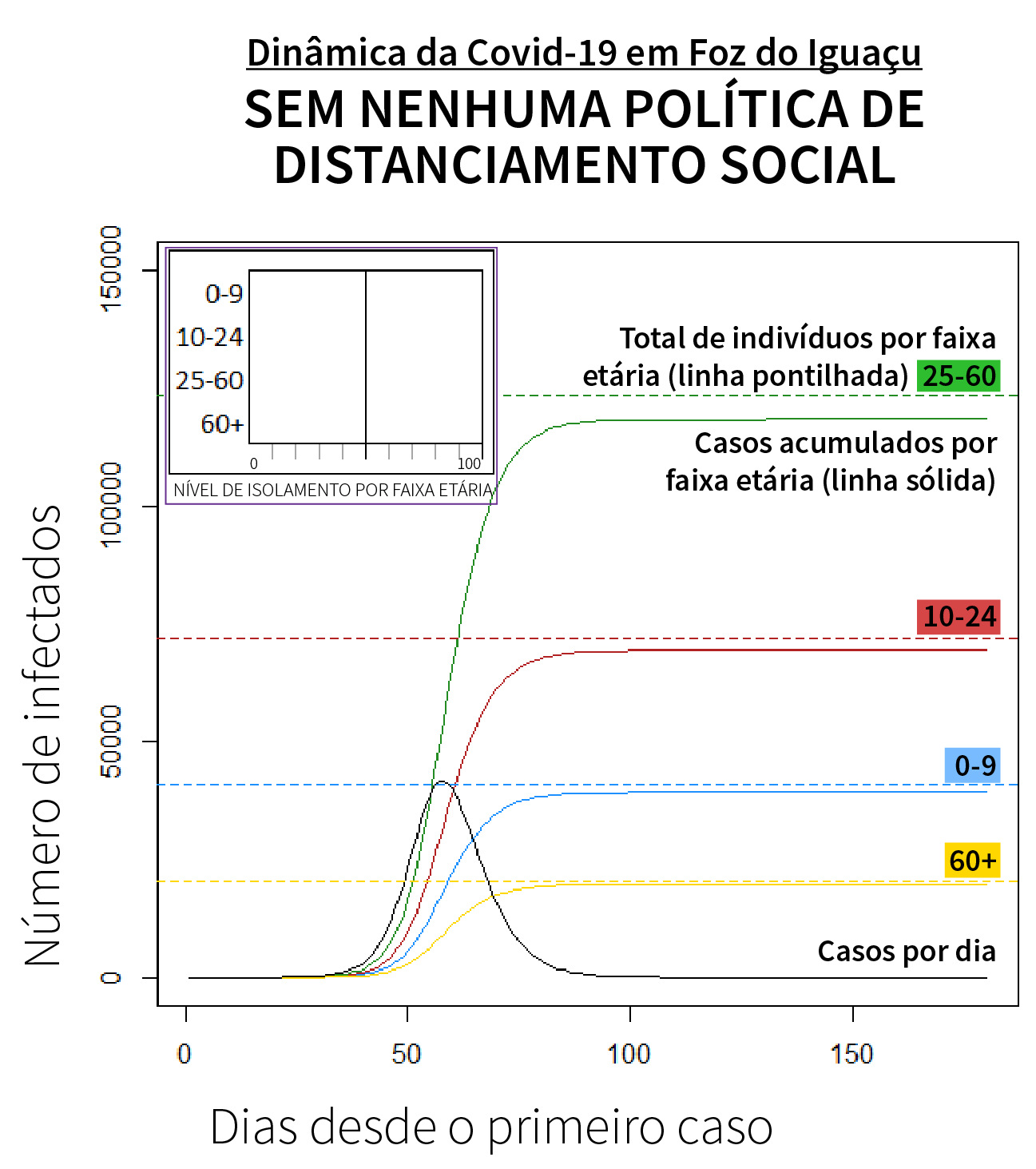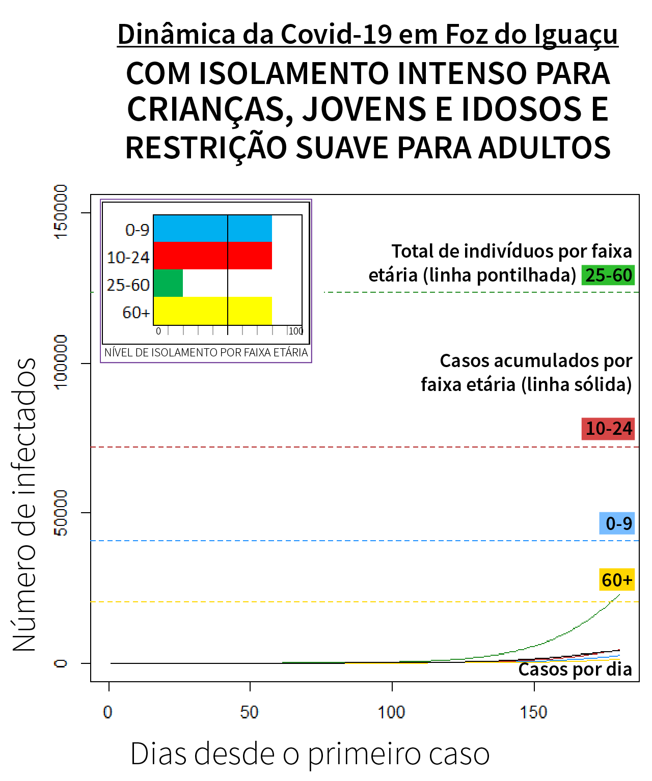 Na comparação de alguns cenários, o estudo mostrou que se 20% dos adultos (25 a 59 anos) e 90% dos idosos, jovens e crianças de Foz do Iguaçu respeitassem o isolamento de forma rigorosa, haveria um ganho qualitativo em termos de tempo e tamanho do pico de infecção. Isso porque na cidade, a faixa etária de 25 a 59 anos representa quase 50% da população, segundo dados do Instituto Paranaense de Desenvolvimento Econômico e Social (Ipardes).