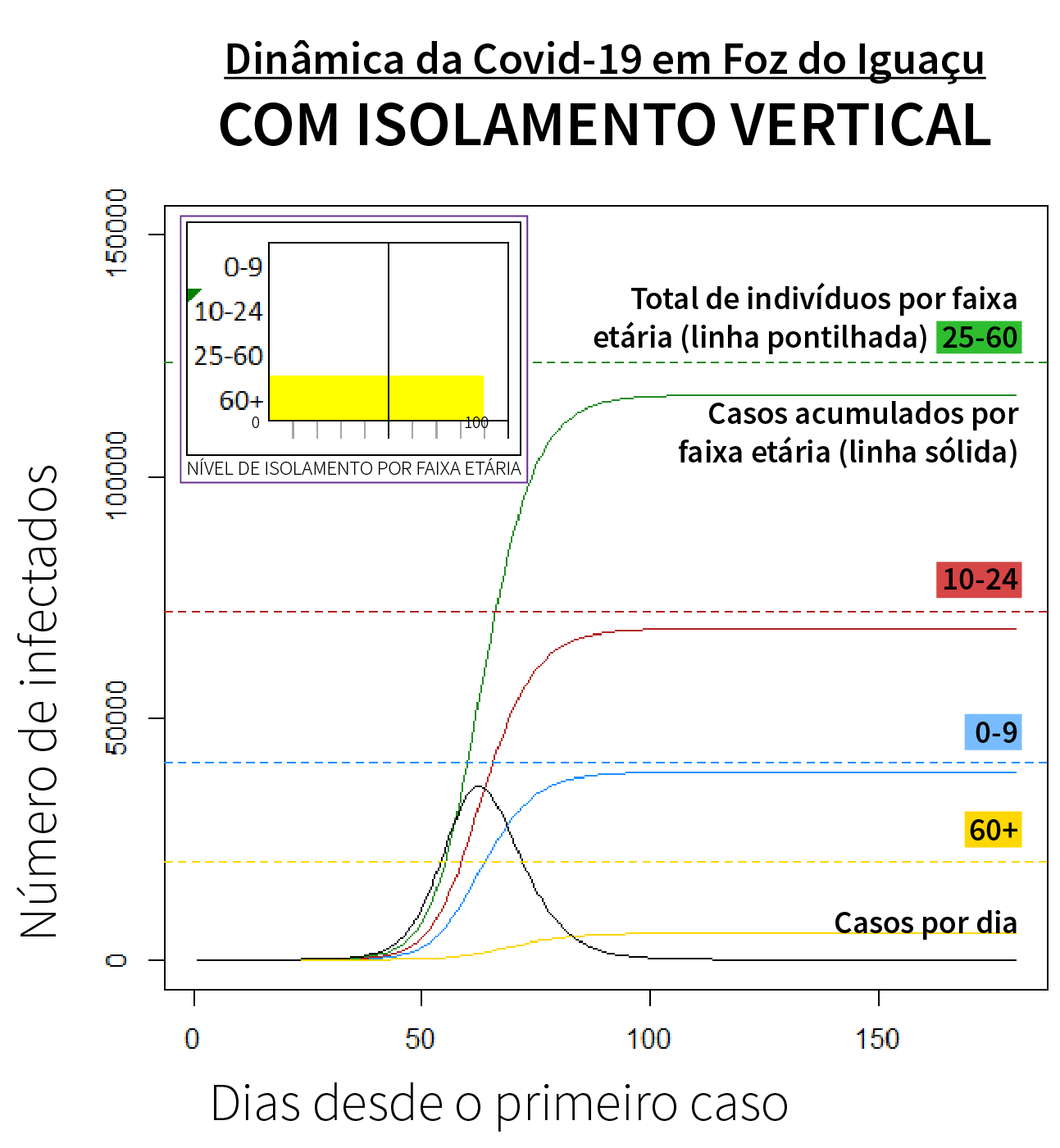 Outro dado que deve ser levado em consideração no momento de pensar políticas de combate à pandemia, é a população de idosos. Aproximadamente 7% dos moradores de Foz do Iguaçu têm mais de 60 anos e, por isso, o isolamento vertical, focado apenas nessa faixa etária, seria uma estratégia ineficaz. “Nesse tipo de isolamento, apenas uma parcela pequena dos suscetíveis seria retirada de forma mais forte da dinâmica da população. E a maior parte das interações sociais e, consequentemente, eventos de contágio, vai ocorrer entre crianças, jovens e adultos, que representam a grande maioria da população”, complementa o docente.
