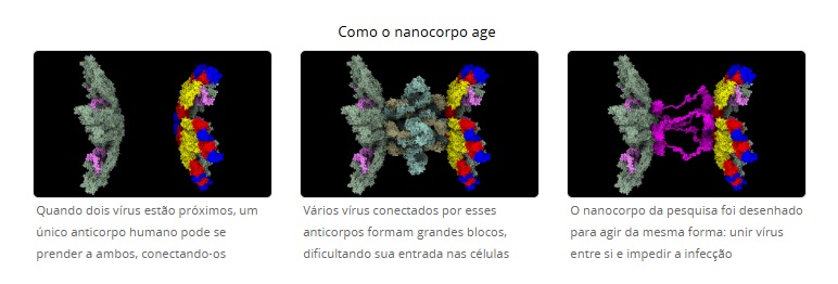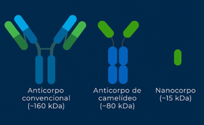 Nanocorpos são proteínas que funcionam como anticorpos, mas são muito menores, mais estáveis e mais fáceis de produzir. Assim como os anticorpos tradicionais, eles reconhecem e neutralizam agentes invasores, como vírus e bactérias. Entre os tipos de anticorpos conhecidos, os convencionais (como os dos humanos) são os maiores. Já os camelídeos (como lhamas e camelos) e alguns peixes cartilaginosos, como tubarões, possuem anticorpos menores. A partir desses anticorpos especiais, é possível isolar uma parte funcional chamada nanocorpo, que tem cerca de um décimo do tamanho de um anticorpo convencional (veja ilustração).