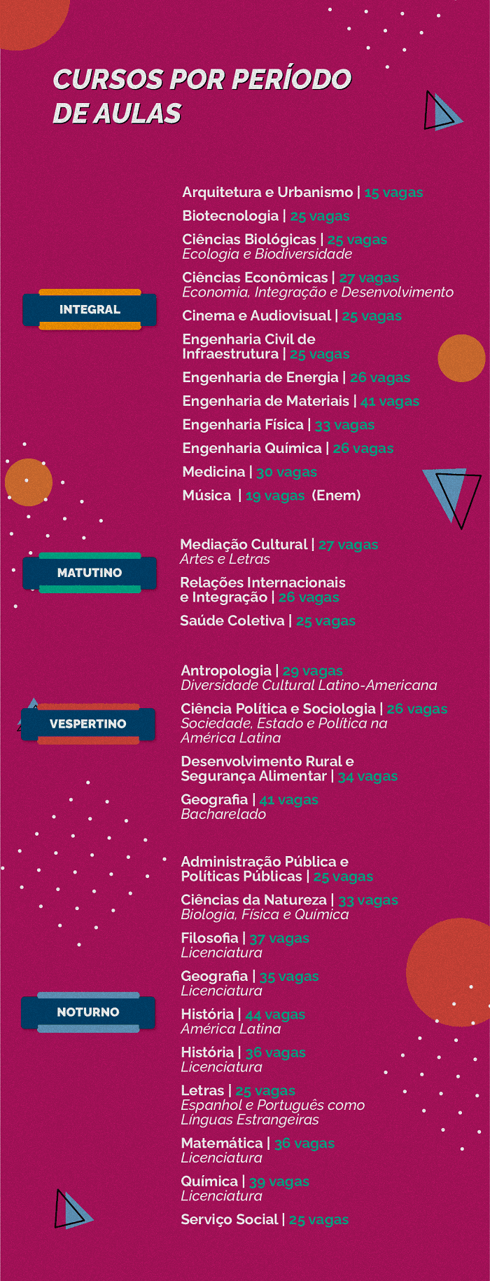 A Universidade Federal da Integração Latino-Americana oferece 841 vagas em 28 cursos de graduação; curso de Música terá seleção própria por meio do Enem e oferece 19 vagas. A Universidade Federal da Integração Latino-Americana (UNILA) oferece 841 vagas em 28 cursos de graduação para ingresso em 2024, por meio do SISU. Os interessados em estudar […]