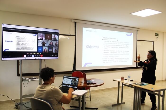 A professora Andrea Mazacotte defendeu na tarde da quarta-feira (8) a sua tese “Saberes de Docentes sobre a educação de Surdos em Contexto Multilíngue de Fronteira”, no Programa de Doutorado em Sociedade, Cultura e Fronteiras, da Universidade Estadual do Oeste do Paraná (Unioeste), campus Foz do Iguaçu. Foi a primeira surda a defender tese na Unioeste.