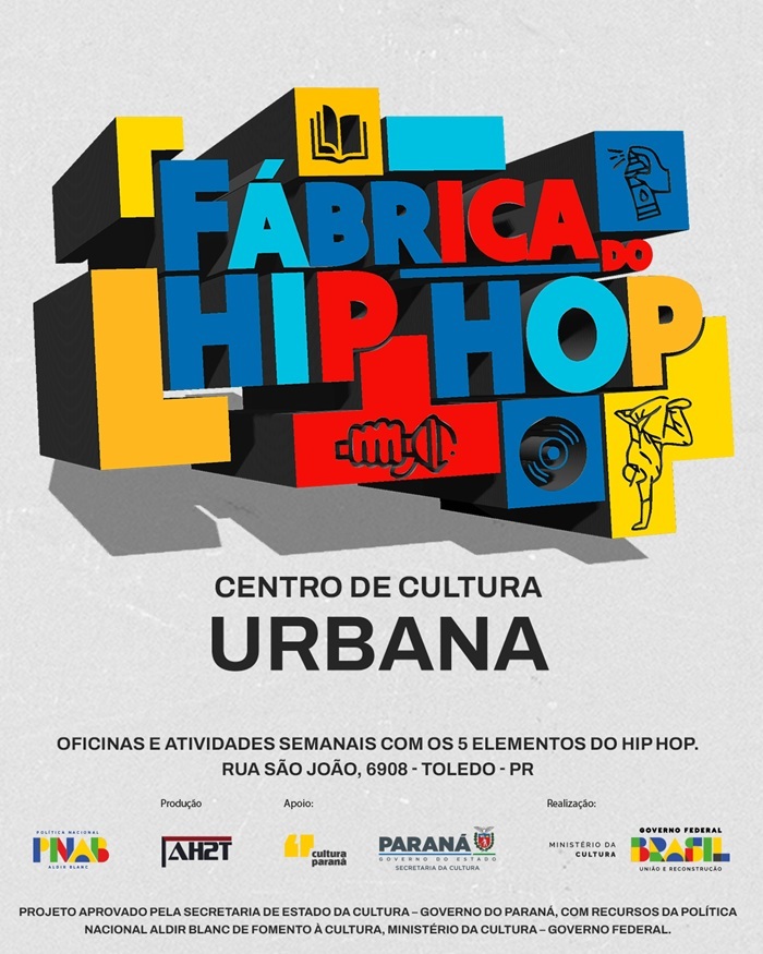 A Fábrica do Hip-Hop é mais um projeto pioneiro que acontece em Toledo, oferecendo atividades e oficinas gratuitas com os cinco elementos da cultura hip-hop para a comunidade local. As atividades vão acontecer semanalmente à partir do dia 30 de agosto na Fábrica do Hip-Hop, situada na Rua São João, 6908, próximo à rodoviária de Toledo.