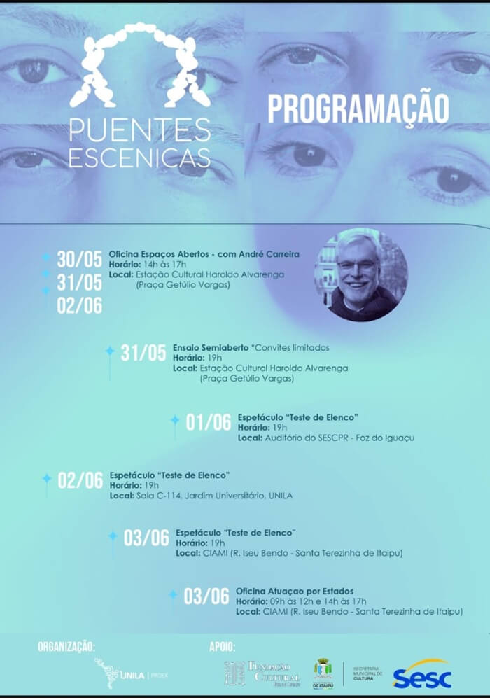 No período de 30 de maio a 3 de junho, o diretor da peça, André Carreira, irá ministrar as oficinas “Espaços Abertos” e “Atuação por Estados”. As inscrições estão abertas e podem ser feitas via Inscreva.