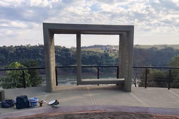 . Leia também: Parque Nacional do Iguaçu fecha semestre com 855 mil visitantes . “É uma obra de concreto e seu desenho se destaca pela criação de uma casca monolítica que se junta para formar um banco suspenso, proporcionando uma experiência única a quem o utiliza”, descreve a prefeitura de Puerto Iguazú, em postagem na rede social Facebook. . “A disposição da obra permite uma vista livre e envolvente do entorno fluvial, criando um espaço ideal para relaxamento e conexão com a natureza. Contribui, também, para o enriquecimento da paisagem urbana, promovendo a interação dos cidadãos com o entorno natural”, complementa a publicação. . O espaço está situado no final da Avenida Antártida Argentina, tendo como ponto de referência o Folks Iguazú Lodge (veja no mapa abaixo). O horário mais procurado para visita é o do final da tarde, momento em que é possível apreciar o Sol pondo-se atrás da margem paraguaia do Rio Paraná. . . Inauguração foi na última quinta-feira (29), com a presença de autoridades e moradores do entorno. Foto: Gentileza/Prefeitura de Puerto Iguazú . De H2Foz