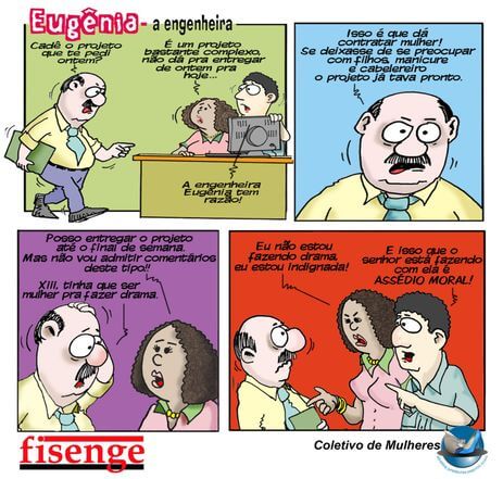 No quadrinho escolhido, a Engenheira Eugênia sofre assédio moral do seu chefe durante o trabalho e é desqualificada por ele por ser mulher. A proposta da atividade vai além do conteúdo: convida estudantes a reconhecerem essas situações e a refletirem, por meio do diálogo, sobre respeito, igualdade e direitos no ambiente profissional.