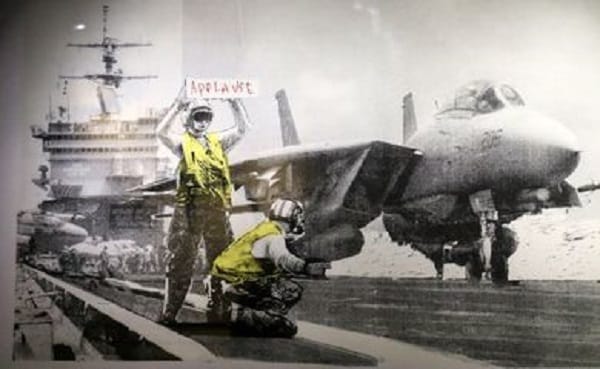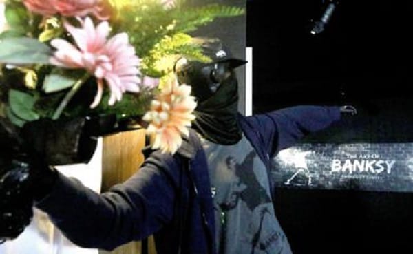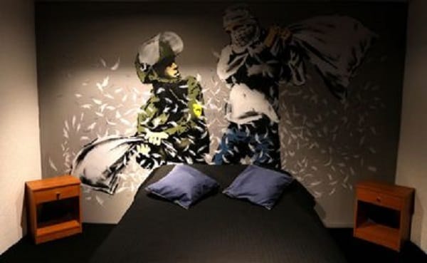. Banksy visitou a Palestina algumas vezes e em todas deixou sua arte espalhada pelos muros da cidade, entre elas o mural Soldier Throwing Flowers (2005), que mostra um homem com o rosto coberto por um lenço atirando um ramo de flores em vez de um coquetel molotov, e Stop and Search (2007), pintado em Bethlehem, onde o artista inverte os papéis ao expor um soldado encostado no muro sendo revistado por uma menina. .