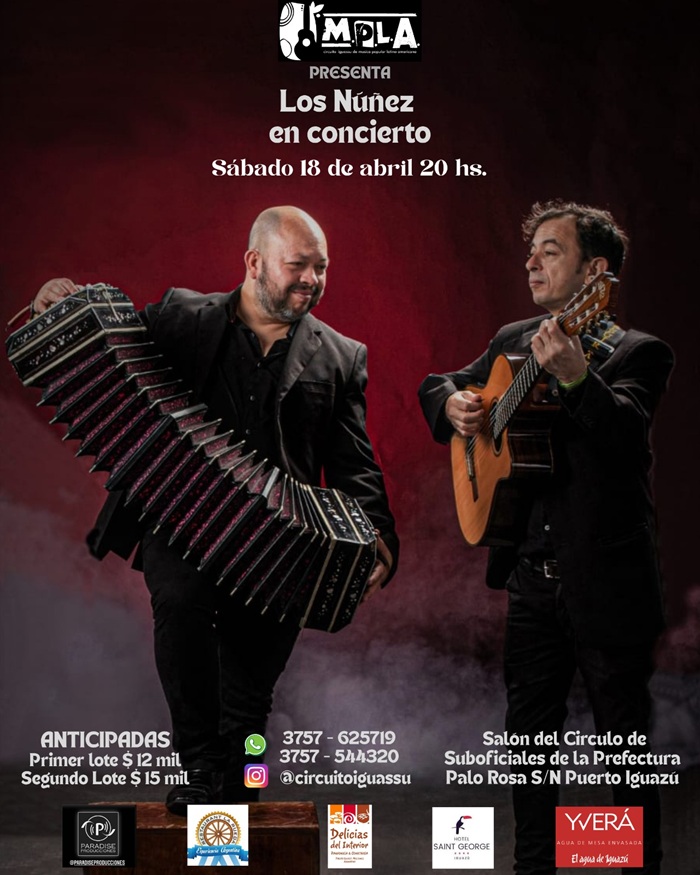O movimento Circuito Iguazu de Música Popular Latino-Americana apresenta “Los Nuñez en Concierto”. Uma noite especial de música do litoral argentino, balizada com toda a força do violão e do bandoneon da dupla virtuose. Los Nuñez, desde Missiones, já faz muito tempo conquistou seu espaço no cenário artístico do país vizinho. O espetáculo musical ocorrerá no sábado, 18, às 20 horas, no Círculo de Sub-oficiais de Prefeitura, com serviço exclusivo de gastronomia. O Círculo está sediado na rua Palo Rosa, s/n., Puerto Iguazú.