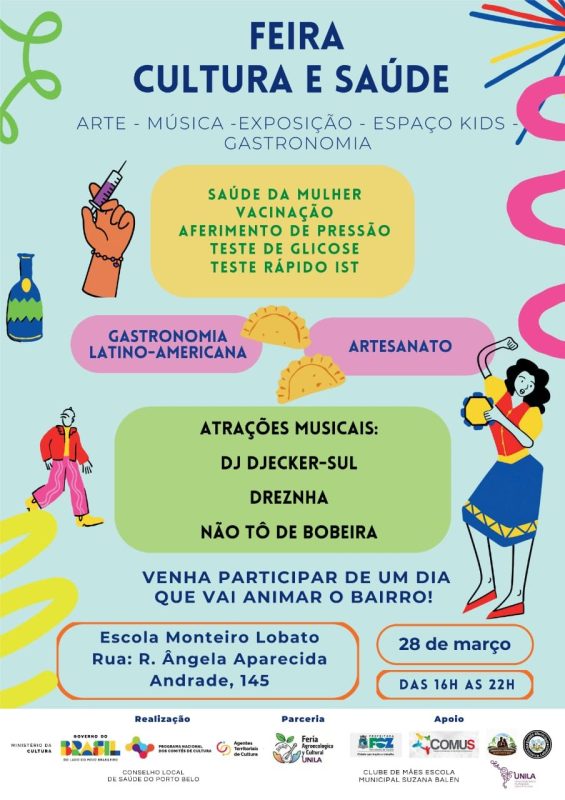 Neste sábado (28), a partir das 16 horas, a Escola Municipal Monteiro Lobato, localizada no bairro do Porto Belo, região norte de Foz do Iguaçu, será o cenário da “Feira Cultura e Saúde”. O evento é uma iniciativa conjunta de vários organismo que atuam naquele bairro iguaçuense, em parceria com a Feira Agroecológica e Cultural e apoio da UNILA. Realizadores da Feira Cultura e Saúde, o Conselho Local de Saúde do Porto Belo e Agentes Territoriais de Cultura, convidam a comunidade do bairro para uma programação bastante diversificada.
