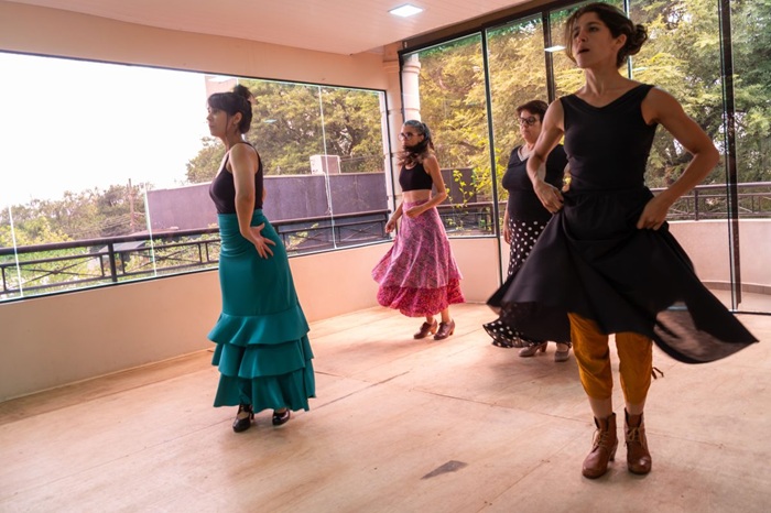 Outra aluna, Daiana Berlusconi, comenta que atravessa a fronteira com a Argentina de moto todo sábado para frequentar as aulas. “Gosto da metodologia, da professora, do grupo de mulheres, gosto de como o flamenco atravessa o meu corpo”, explica.