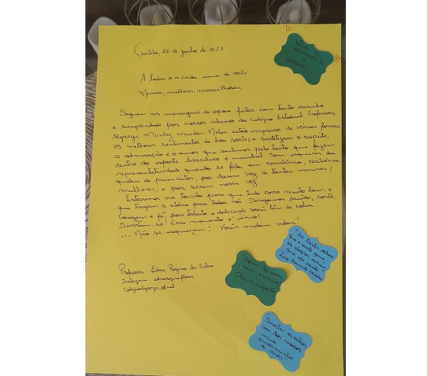 As jogadoras da Seleção Brasileira representam todas as mulheres do País, que podem estar onde quiserem e sabem disso. Os nossos alunos, meninos e meninas, crescem com esse pensamento. Além disso, esse projeto envolve toda a escola e agrega a equipe inteira, tornando essa época muito significativa”, afirma a diretora da escola, Yasodara Collyer de Magalhães Hayashi. . A idealizadora do projeto, professora Edna da Silva, afirma se sentir realizada ao constatar, na prática, o reconhecimento da iniciativa, principalmente diante de um time que luta fora dos gramados por reconhecimento e igualdade. “Significa muito para mim porque sempre gostei de jogar futebol na infância, mas não podia porque diziam que não era um esporte para meninas. E hoje em dia vemos um Campeonato Brasileiro Feminino ganhando força e atletas de destaque mundial, inspirando as novas gerações”, completa. . “As atletas da Seleção e nós, professores, temos muito em comum. De alguma maneira, contribuímos para mudar o mundo. E ver que as estrelas do time do Brasil receberam e leram as cartinhas e saber que se emocionaram com o que os alunos escreveram demonstra que o trabalho valeu a pena”, acrescenta. . . O tom das cartas envolve reconhecimento, respeito e valorização do futebol feminino, amplamente praticado no Paraná. São valores que os estudantes, mesmo muito jovens, já compreendem e gostam de espalhar. “Criticar o futebol feminino é para os fracos. Os fortes apoiam. Acredito que com educação, arte e esporte, podemos mudar o mundo”, assinam os alunos Gabriela e Adriel, do 1º primeiro ano do ensino médio. Como é habitual na tramitação de papéis, as cartas dos estudantes paranaenses foram postadas nos Correios e chegaram na sede da Confederação Brasileira de Futebol (CBF), no Rio de Janeiro. Logo em seguida elas foram encaminhadas ao hotel em que as jogadoras estão hospedadas, na cidade de Brisbane, na Austrália. A reação ficou marcada por uma reportagem do Jornal Nacional, da TV Globo, que foi reproduzida nas redes sociais. “Olha que lindo! Obrigada”, agradeceu Bia, atacante do Palmeiras, ao receber os desenhos de Nicolas Antonio de Moura Silva (13 anos), aluno do 8º ano e um dos mais entusiasmados com a ação. “Ela joga muito”, afirma o jovem. “Eu gostei muito de participar do projeto. Acho importante apoiarmos as jogadoras na hora das partidas e escrever as cartas tornou as aulas mais divertidas e interessantes. Todo mundo adorou”. Já para a jogadora Kerolin, meia que joga nos Estados Unidos, mas começou a carreira no interior de São Paulo, a carta trouxe um conselho que pode ajudar atletas em momentos decisivos. “Se você ficar muito nervosa antes do jogo, respira fundo e pensa que consegue”, diz o recado. Marta, principal estrela do time, comemorou o apoio. Ela é uma das principais vozes da Seleção e, desta vez, foi ouvinte. “Vou guardar as cartas com muito carinho. Vão seguir aqui o tempo inteiro com a gente, do começo ao fim. Estamos juntos”, disse a melhor jogadora do mundo em cinco oportunidades. . Da AEN