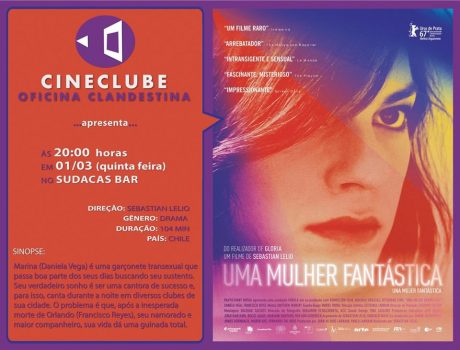 Marcada para às 20 horas, no Sudacas Bar, a rodada sobre cinema nesta quinta, dia 1 de março, vai tratar de “Una Mujer Fantástica”, dirigido pelo chileno Sebastião Lélio, e que concorre ao Oscar no próximo domingo, como melhor filme estrangeiro. O evento, gratuito, é uma iniciativa do Cineclube Oficina Clandestina em parceria com aquele estabelecimento. Marina (Daniela Vega) é uma garçonete transexual que passa boa parte dos seus dias buscando seu sustento. Seu verdadeiro sonho é ser uma cantora de sucesso e, para isso, canta durante a noite em diversos clubes de sua cidade. O problema é que, após a inesperada morte de Orlando (Francisco Reyes), seu namorado e maior companheiro, sua vida dá uma guinada total. O filme é recomendado para maiores de 14 anos. Impulsionado pela boa interpretação de Daniela Vega, “Uma Mulher Fantástica”, concorrerá ao Oscar, na categoria de melhor filme estrangeiro. São seus concorrentes, “The Insult” (Líbano), “Loveless” (Rússia), “On Body and Soul” (Hungría) y “The Square” (Suécia).