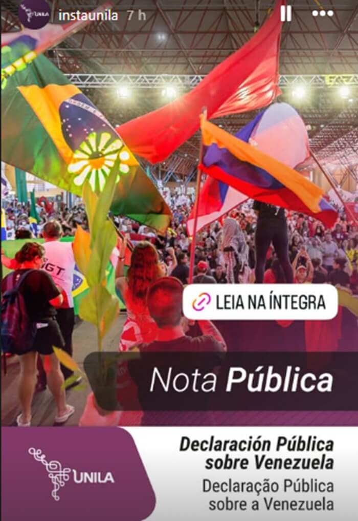 Orientada a sua própria missão institucional, e fiel à construção de um ambiente acadêmico ético e democrático, a Universidade Federal da Integração Latino-Americana cumpre seu papel ao alertar sobre práticas neocolonizadoras e neoextrativistas em andamento na região. A UNILA seguirá atenta aos desdobramentos do cenário internacional, colaborando com a produção de conhecimento sobre a região, e com a defesa da autodeterminação dos povos.”