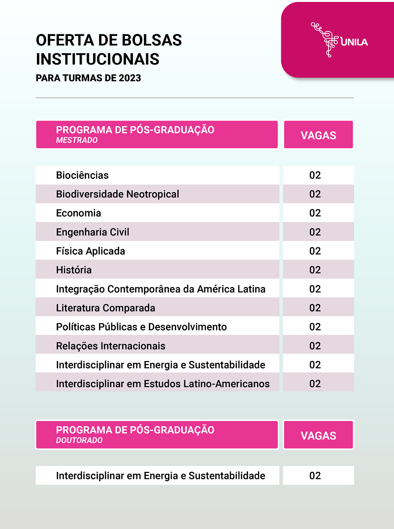 . A Pró-Reitoria de Pesquisa e Pós-Graduação (PRPPG) lançou edital do Programa de Bolsa Institucional da UNILA, direcionado para estudantes que estejam ingressando em programas de pós-graduação neste ano de 2023. Entre os pré-requisitos está o de dedicação exclusiva para atividades do programa; estar residindo em Foz do Iguaçu ou nas cidades vizinhas de Ciudad del Este e Puerto Iguazú; e comprovar bom desempenho acadêmico. Todas as informações sobre o processo de seleção podem ser consultadas no Edital PPRPG 02/2023.