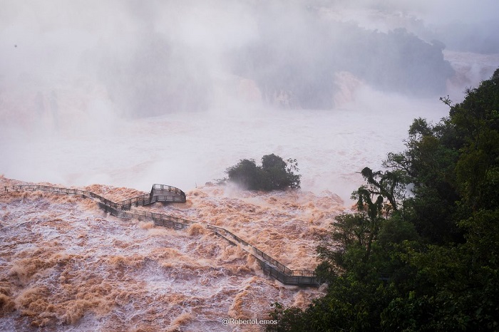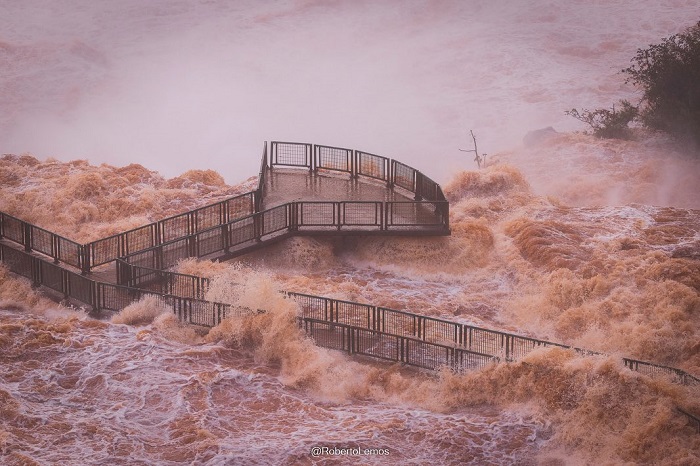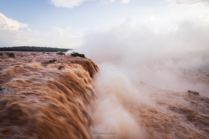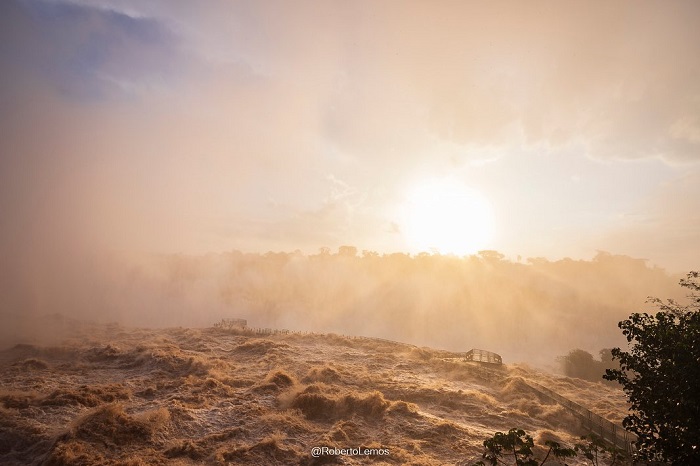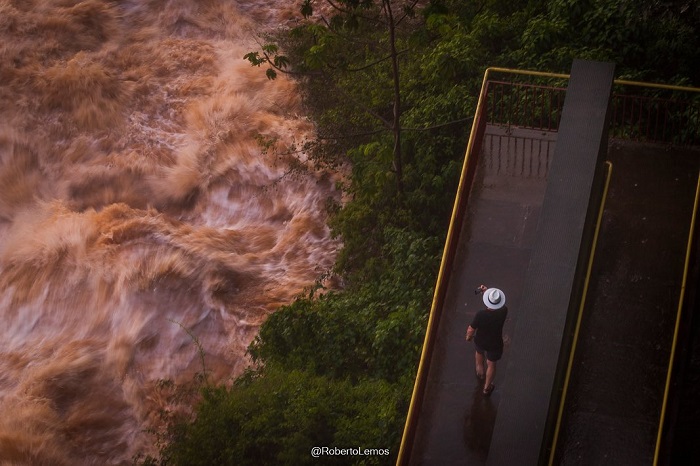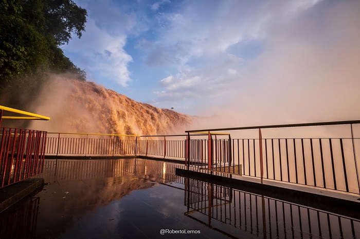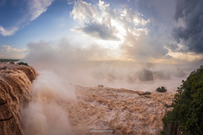 A vazão das Cataratas do Iguaçu é, em média, é de 1,5 milhão de litros de água por segundo. Neste final de outubro, já chegou a mais de 24 milhões de litros por segundo. No domingo, dia do ensaio feito pelo fotógrafo Roberto Lemos, a vazão era cerca de 13 vezes a média.